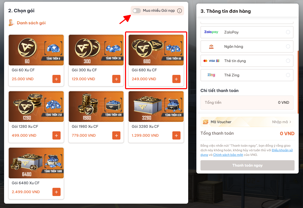 - Bước 3: Tắt nút Mua nhiều Gói Nạp và Chọn Gói 680 Xu CFL mệnh giá 249.000 VNĐ và chọn phương thức thanh toán.