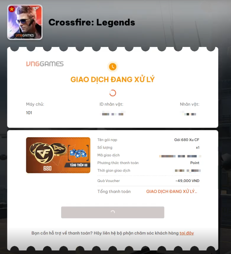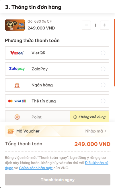 a. Cảnh báo: Nếu cố tình nhập Voucher để nạp lần thứ 2, giá gói sẽ quay về mức gốc (249k). Tiền nạp vào sẽ không đủ để mua gói -> Dẫn đến giao dịch thất bại và tiền bị kẹt lại (Point tồn) trên web.