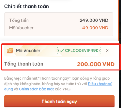 Ví dụ: Nếu bật 2 trình duyệt và nhập mã code 2 lần cho 1 tài khoản thì sẽ chỉ tính 1 lần, lần còn lại sẽ tính vào thành toán không có voucher.